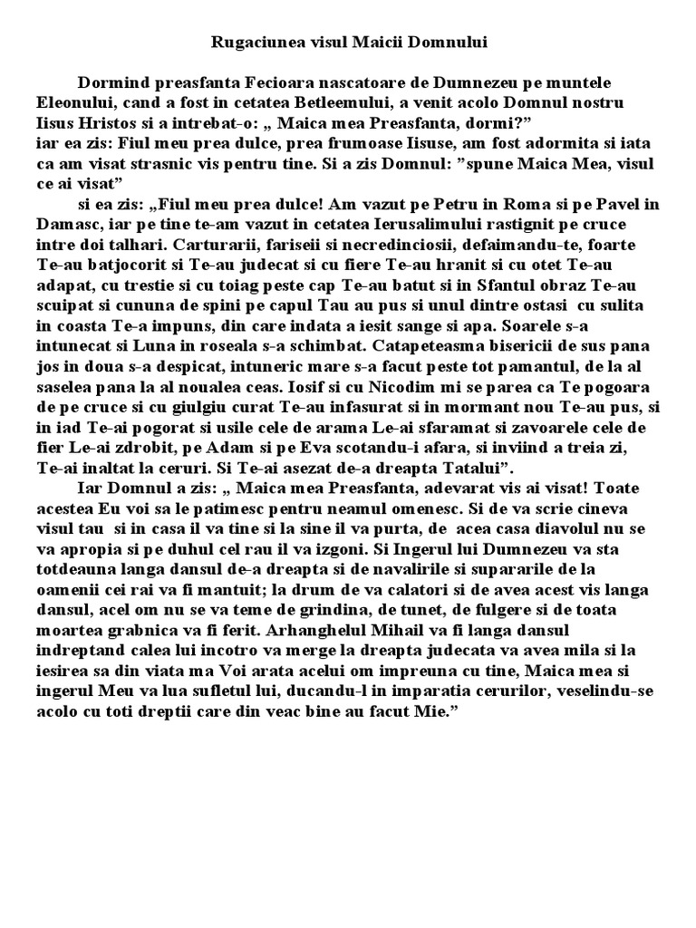 Preaminunata si buna ascultatoare marie, preacurata maica a cuvantului, nimic altceva afara de dragostea lui dumnezeu nu stiu sa imi doresc si in ultimele mele clipe, la inchinarea catre iisus sa pot veni, de relele straji ale vamilor sa ma.