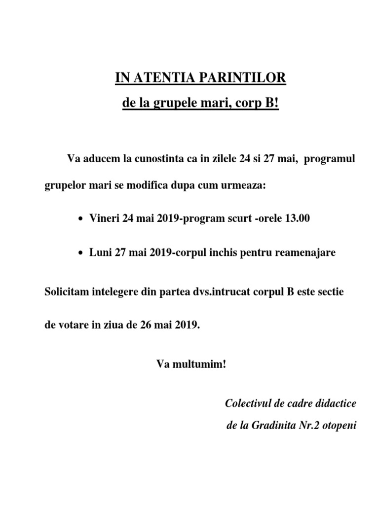vizitati articolul complet aici : https://ru.scribd.com/document/447009614/anunt-docx To bring to somebody's attention. O facut oare cineva cunostinta prin asa metoda? Nu se mai trezeşte plângând că nu vrea la grădi.