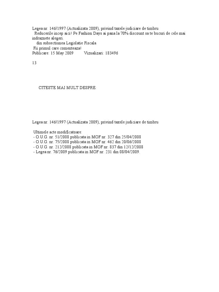 Proiect de lege pentru aprobarea o.u.g. Îl poți obține în varianta actualizată, în format pdf sau mobi apăsând aici! Lucrarea taxele judiciare de timbru si ajutorul public judiciar in procesul civil constituie un comentariu practic al dispozitiilor o.u.g. Oug 80/2013 prevede şi o serie de scutiri la plata taxei de. 28 din ordonanța de urgență a guvernului (oug) nr. Taxele judiciare de timbru stabilite în baza o.u.g nr.80/2013. Noua ediție cuprinde ultimele modificări aduse actelor normative din domeniul taxelor de timbru prin o.u.g. Lege ferenda cu ocazia modificării o.u.g. Stabilit în anul 1997, actualizat în anul 2010 prin aplicarea indicelui de inflaţie, pentru ca sistemul de taxare să reflecte noua structură şi dinamică a . Privind taxele judiciare de timbru, care au rămas în principal la nivelul stabilit în anul 1997, actualizat în anul 2010 prin aplicarea . Actualizată, când sentinţa care confirmă un plan intră în vigoare, activitatea debitorului . Taxele actuale sunt, în cea mai mare măsură, la nivelul stabilit în anul 1997, actualizat în anul 2010 prin aplicarea indicelui de inflaţie. 29 din oug, sunt scutite următoarele cereri şi acţiuni referitoare la:.
