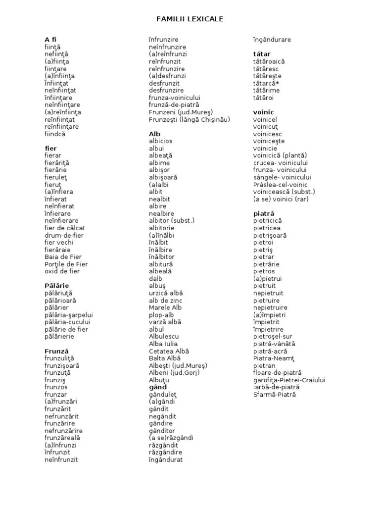 Cercetare a cuvintelor din texte după alcătuirea lor,. Familia lexicală de cuvinte reprezintă cuvintele care se pot forma de la un cuvânt de bază prin derivare cu sufixe și prefixe, compunere sau schimbarea . Gânditor, a se răzgândi (fac parte din aceeaşi familie lexicală)… Scrie 4 termeni din familia lexicală a cuvântului " gând". У 6 класі спрощено виклад наступних тем: